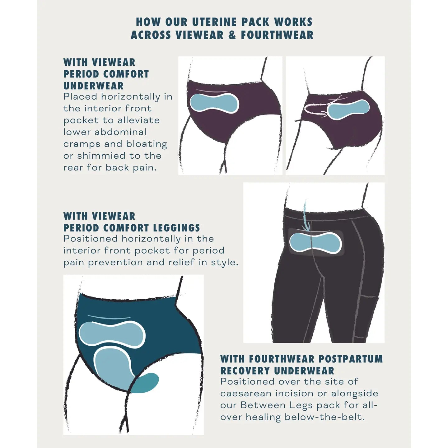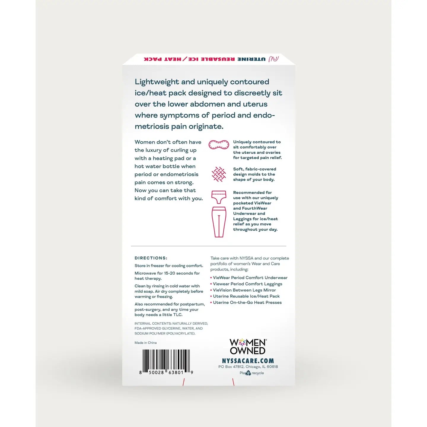 The first ice/heat pack is uniquely contoured to fit over women's lower abdomen and uterus, where the symptoms of period, endometriosis, and postpartum pains originate. Measures 8.5 inches in length and less than 0.25 inches in thickness, so that it provides full, effective coverage while also being comfortable and 'barely there' inside the pocket of our VieWear or FourthWear underwear. Store in the freezer for cooling comfort. Microwave at 15-second intervals for heat therapy. Do not machine wash. When needed, clean by rinsing in cold water with mild soap and let air dry completely before warming or freezing.